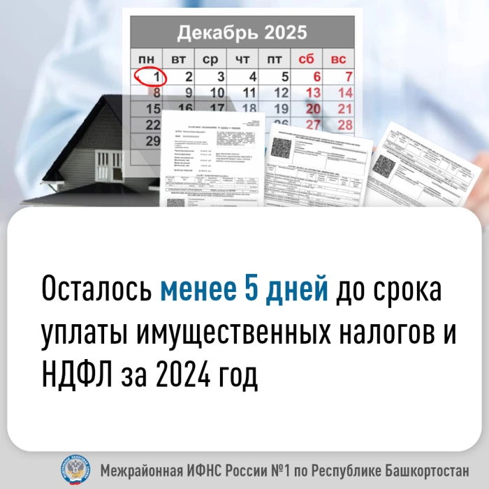 Межрайонная ИФНС России 1 напоминает, что срок уплаты имущественных налогов (земля, недвижимость, транспорт) физических лиц и налога на доходы физических лиц за 2024 год не позднее 1 декабря 2025 года.