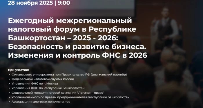 С 28 ноября 2025 года планируется проведение Ежегодного межрегионального налогового форума в Республике Башкортостан 2025-2026: Безопасность и развитие бизнеса. Изменения и контроль ФНС в 2026 (далее Форум) (место проведения